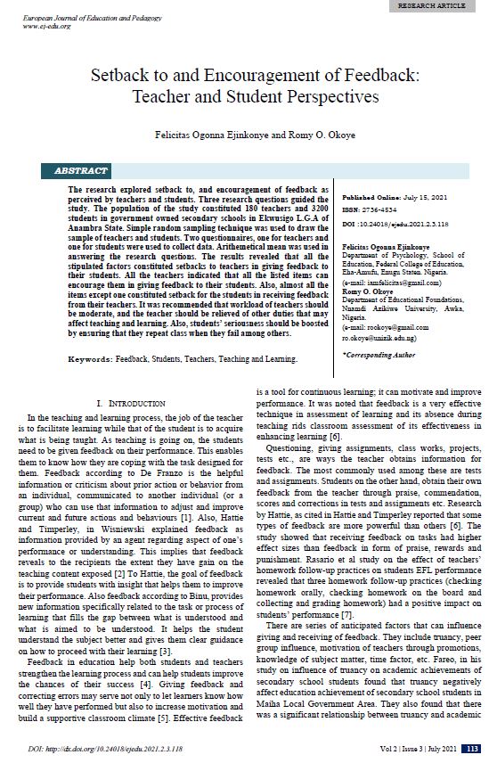 The research explored setback to, and encouragement of feedback as perceived by teachers and students. Three research questions guided the study. The population of the study constituted 180 teachers and 3200 students in government owned secondary schools in Ekwusigo L.G.A of Anambra State. Simple random sampling technique was used to draw the sample of teachers and students. Two questionnaires, one for teachers and one for students were used to collect data. Arithemetical mean was used in answering the research questions. The results revealed that all the stipulated factors constituted setbacks to teachers in giving feedback to their students. All the teachers indicated that all the listed items can encourage them in giving feedback to their students. Also, almost all the items except one constituted setback for the students in receiving feedback from their teachers. It was recommended that workload of teachers should be moderate, and the teacher should be relieved of other duties that may affect teaching and learning. Also, students’ seriousness should be boosted by ensuring that they repeat class when they fail among others.