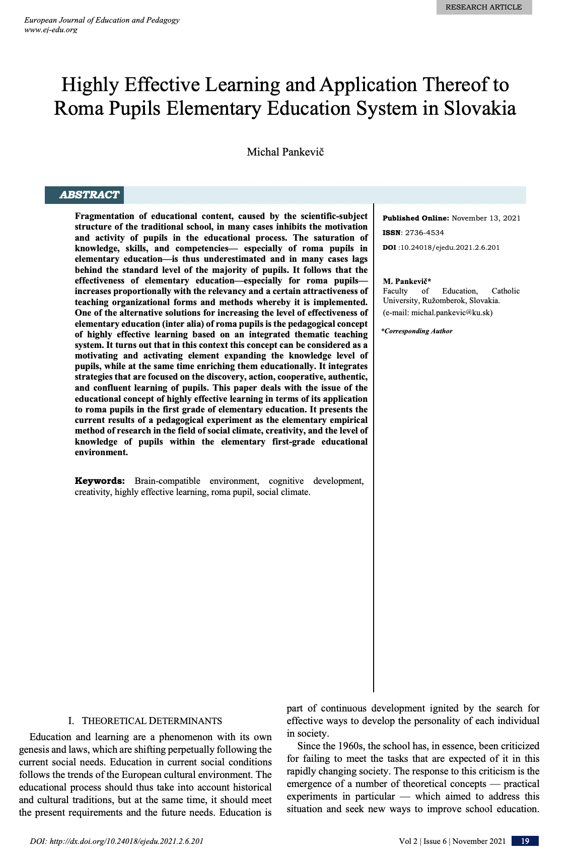 Fragmentation of educational content, caused by the scientific-subject structure of the traditional school, in many cases inhibits the motivation and activity of pupils in the educational process. The saturation of knowledge, skills, and competencies— especially of roma pupils in elementary education—is thus underestimated and in many cases lags behind the standard level of the majority of pupils. It follows that the effectiveness of elementary education—especially for roma pupils—increases proportionally with the relevancy and a certain attractiveness of teaching organizational forms and methods whereby it is implemented. One of the alternative solutions for increasing the level of effectiveness of elementary education (inter alia) of roma pupils is the pedagogical concept of highly effective learning based on an integrated thematic teaching system. It turns out that in this context this concept can be considered as a motivating and activating element expanding the knowledge level of pupils, while at the same time enriching them educationally. It integrates strategies that are focused on the discovery, action, cooperative, authentic, and confluent learning of pupils. This paper deals with the issue of the educational concept of highly effective learning in terms of its application to roma pupils in the first grade of elementary education. It presents the current results of a pedagogical experiment as the elementary empirical method of research in the field of social climate, creativity, and the level of knowledge of pupils within the elementary first-grade educational environment.