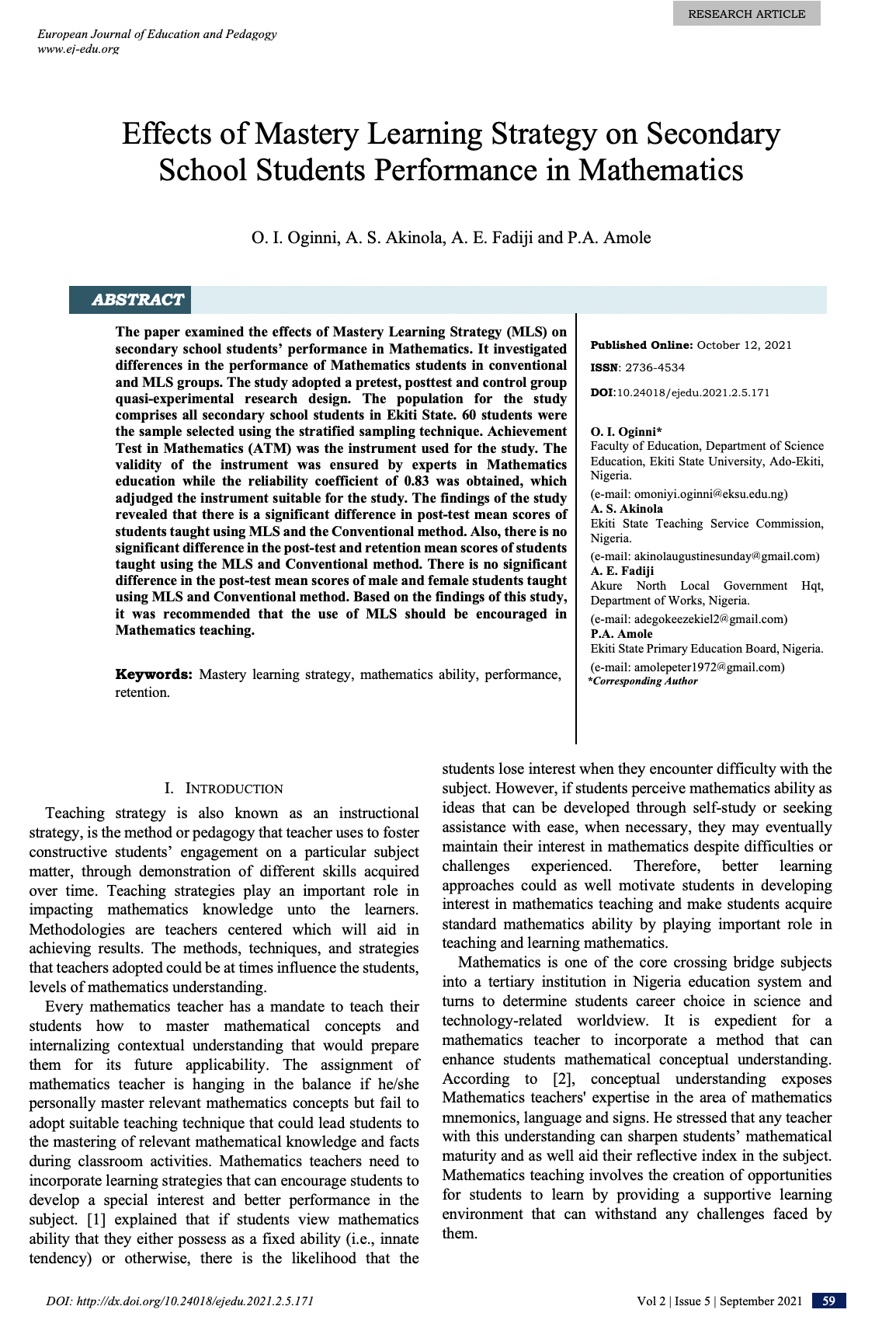 Effects of Mastery Learning Strategy on Secondary School Students Performance in Mathematics