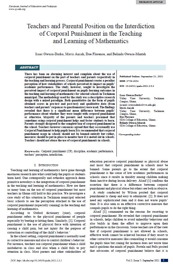 Teachers and Parental Position on the Interdiction of Corporal Punishment in the Teaching and Learning of Mathematics