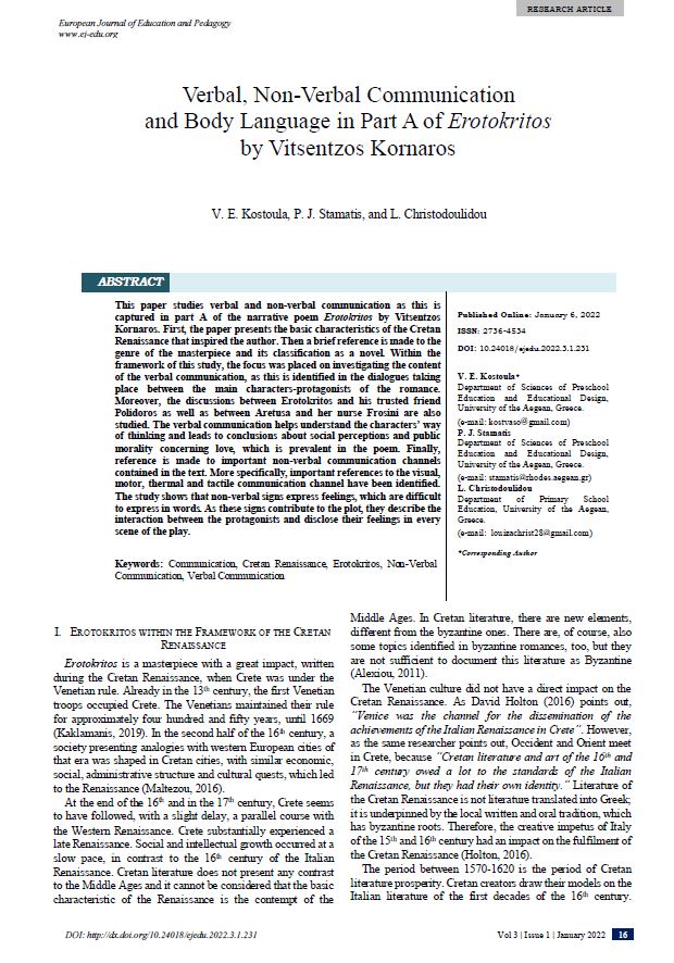 Verbal, Non-Verbal Communication and Body Language in Part A of Erotokritos by Vitsentzos Kornaros