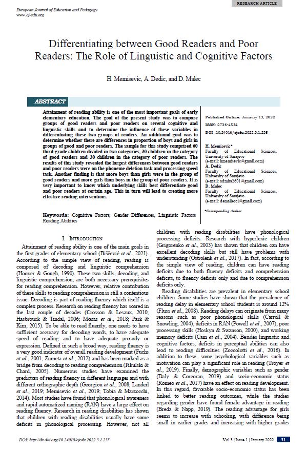 Differentiating between Good Readers and Poor Readers: The Role of Linguistic and Cognitive Factors