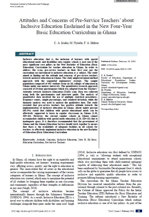Attitudes and Concerns of Pre-Service Teachers’ about Inclusive Education Enshrined in the New Four-Year Basic Education Curriculum in Ghana