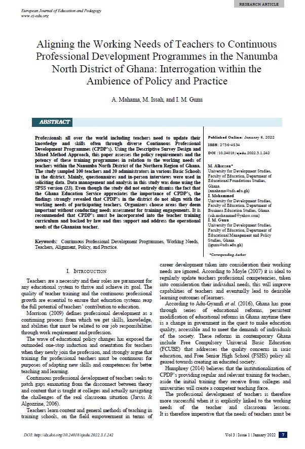 Aligning the Working Needs of Teachers to Continuous Professional Development Programmes in the Nanumba North District of Ghana: Interrogation within the Ambience of Policy and Practice