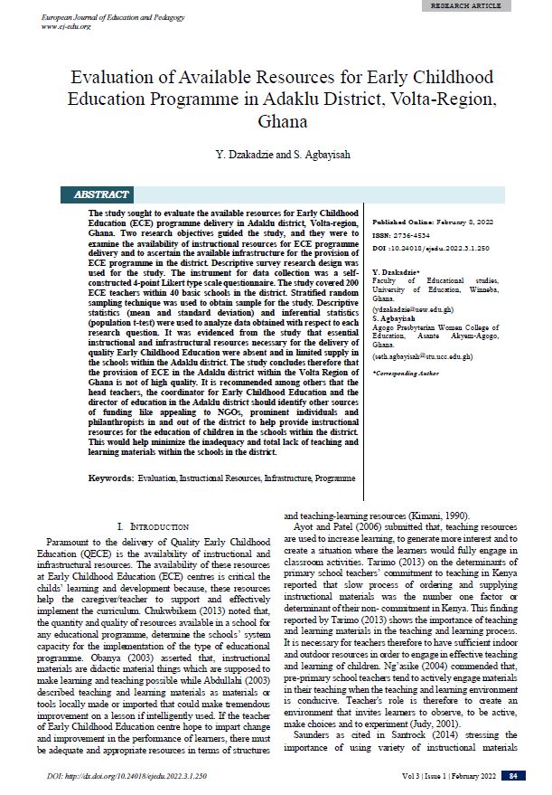 Evaluation of Available Resources for Early Childhood Education Programme in Adaklu District, Volta-Region, Ghana