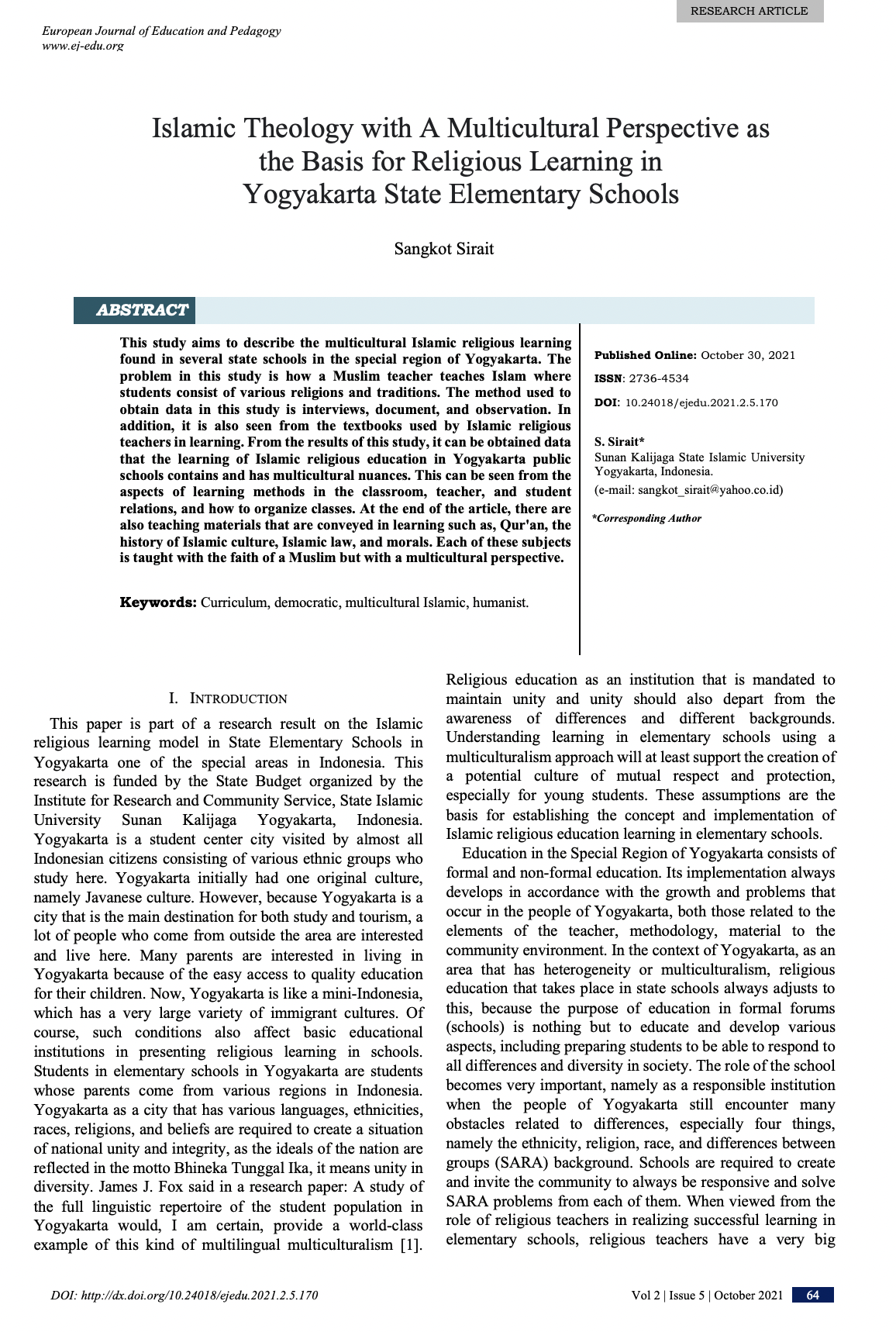 The Islamic Theology with A Multicultural Perspective as the Basis for Religious Learning in Yogyakarta State Elementary Schools
